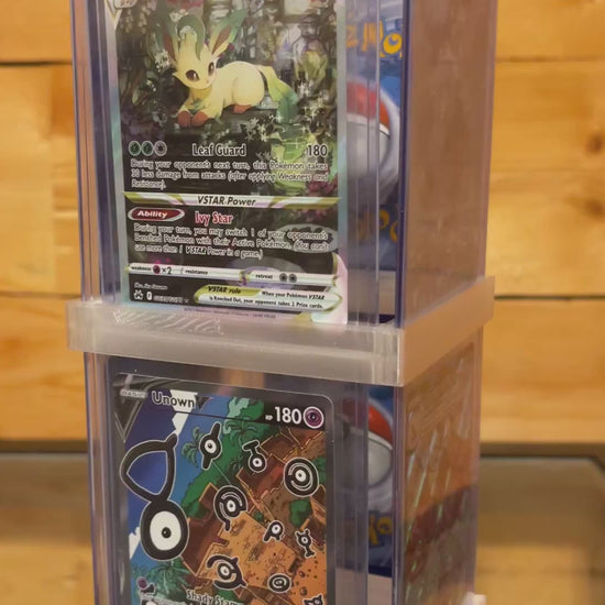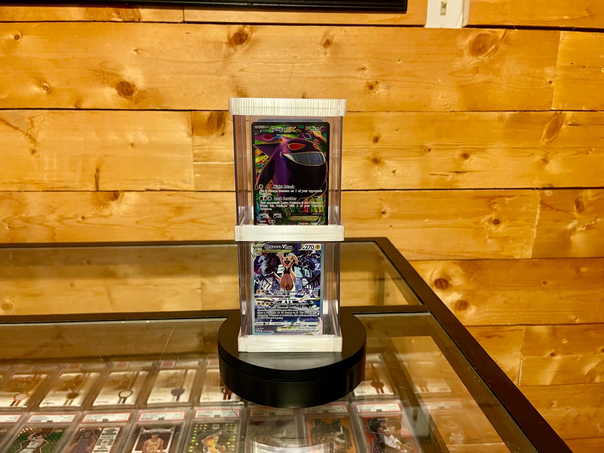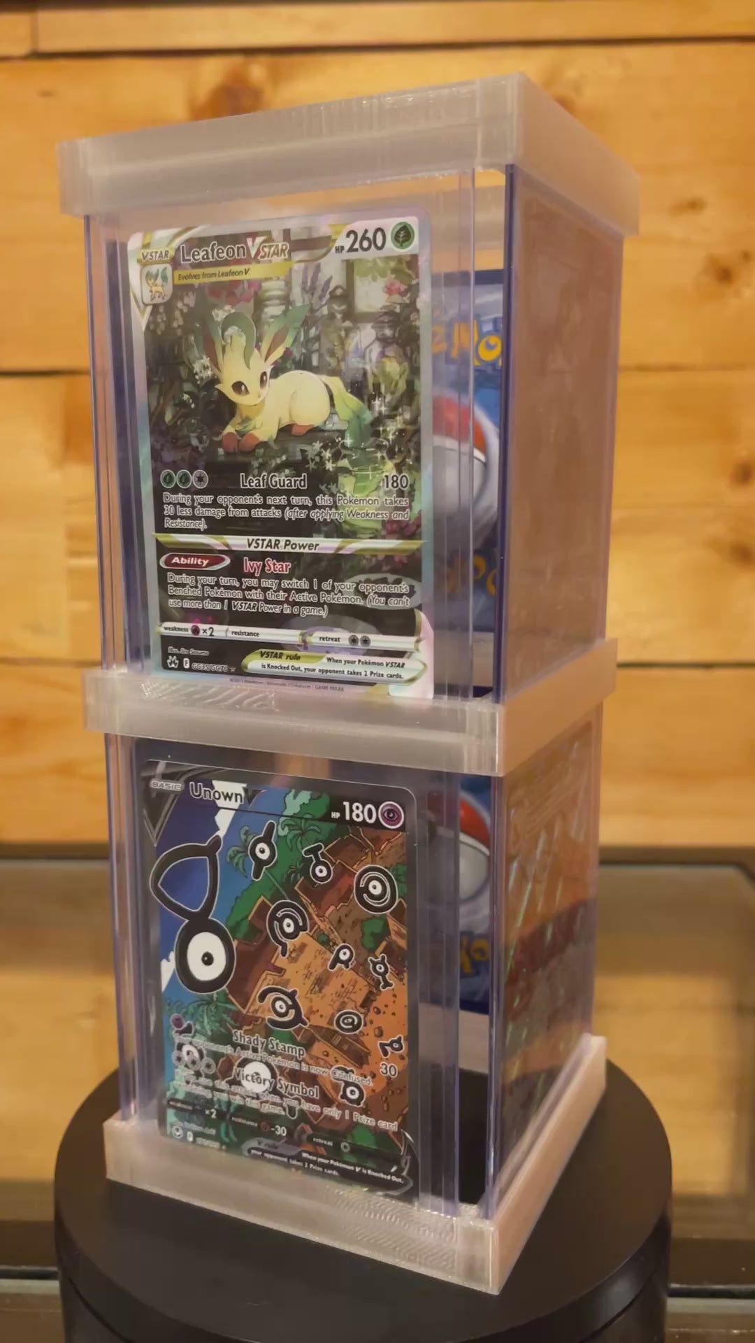 These stands hold 4 one touch standard thickness cards (35 point). Each stand has slots on top or bottom so any stand can be a base, stacker, or top.